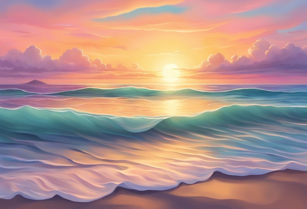 A serene beach at sunset, with gentle waves and a vibrant sky, symbolizing the manifestation of love through vibrational alignment